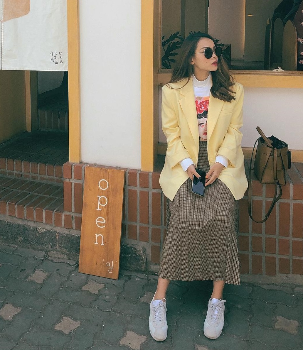 Đôi lúc, Yến Trang quay về với cách phối đồ khá quen thuộc, đó là chân váy dài phối với áo blazer. Công thức này mang đến nét trẻ trung, ngọt ngào nhưng vẫn thanh lịch cho người diện. Muốn phong cách diện chân váy dài luôn tươi mới và nổi bật, chị em rất nên tham khảo style của Yến Trang.