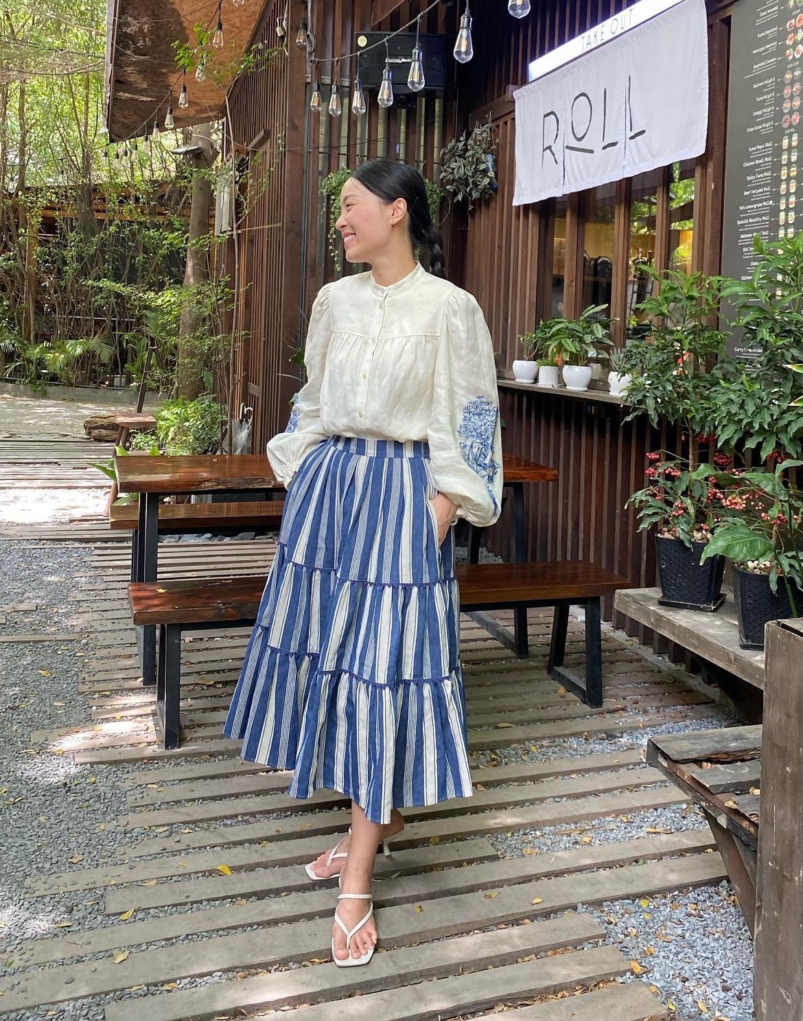 Tăng Thanh Hà duy trì nét tinh tế cho phong cách nhờ kết hợp chân váy dài với các mẫu áo như áo gile, áo cardigan trơn màu trung tính hay áo kẻ ngang. Bên cạnh đó, Tăng Thanh Hà còn khéo léo tôn dáng khi hoàn thiện các set chân váy dài bằng giày mule, sandal hoặc giày lười.