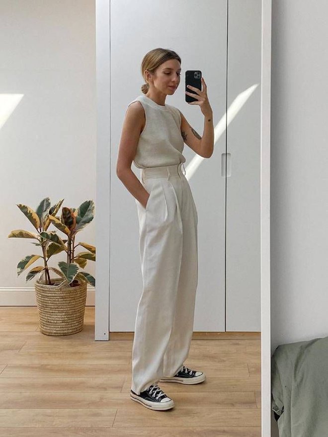 Tất nhiên phong cách thời trang Pháp không chỉ có sự nữ tính, nhẹ nhàng mà chúng còn vô cùng thời trang và cá tính. Tiêu biểu phải kể đến công thức phối áo thun sát nách với quần ống rộng. Ý tưởng này chắc chắn sẽ chiếm được cảm tình các cô nàng ưa chuộng phong cách năng động, hiện đại và tinh tế.