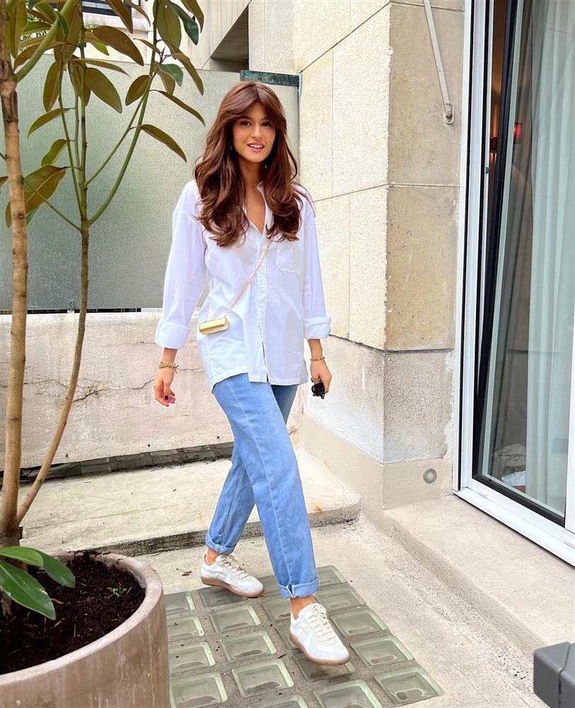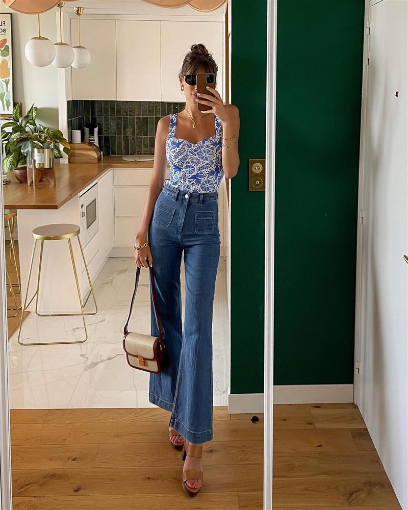 Quần jeans là món thời trang chị em có thể mặc quanh năm suốt tháng, kể cả mùa hè. Miễn là chị em chọn một chiếc quần jeans phiên bản thoải mái, outfit sẽ không gây nóng nực, khó chịu. "Chân ái" của phụ nữ Pháp trong mùa hè là quần jeans ống đứng hoặc quần jeans ống suông, ống loe. Các mẫu quần jeans này đều không bó sát, diện lên vẫn dễ chịu. Quần jeans là món thời trang dễ mặc dễ đẹp nhất, cách mix vô cùng phong phú. Quần jeans khi kết hợp với áo thun sẽ tạo nên outfit trẻ trung, năng động. Trong trường hợp mix cùng áo blouse, chị em sẽ hoàn thiện được vẻ ngoài nữ tính, nhưng không kém phần bụi bặm.