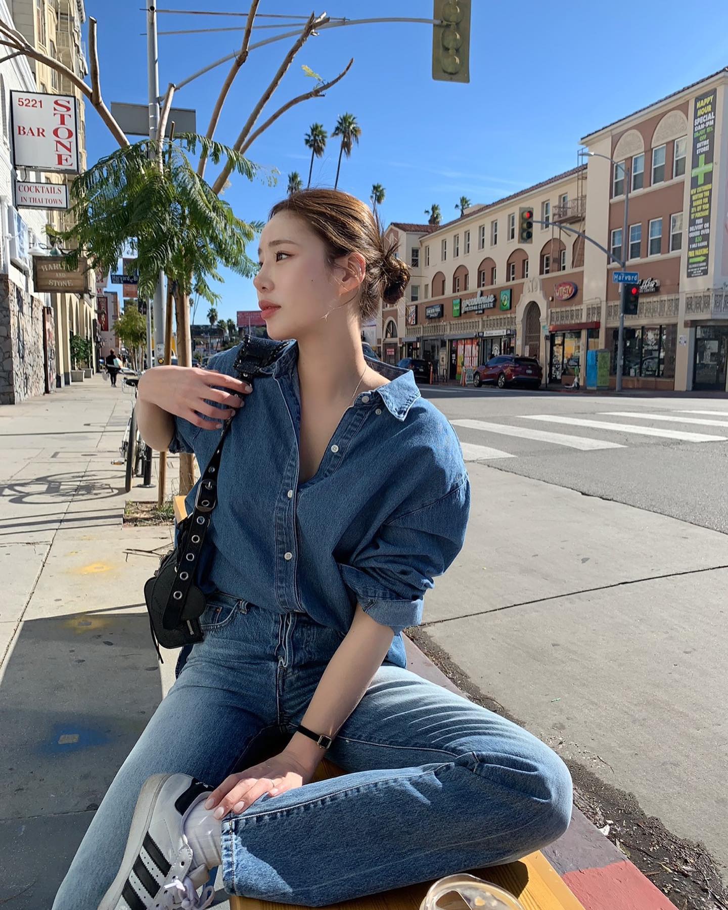 Bên cạnh đó, áo sơ mi denim còn cho hiệu quả hack tuổi, nhờ nét bụi bặm, cá tính. Các quý cô sành điệu thường kết hợp áo sơ mi denim với quần jeans. Nhờ vậy, họ có được set trang phục nổi bật và phảng phất nét retro. Để nâng cấp vẻ sang xịn mịn cho set áo sơ mi + quần jeans, bạn nên tô điểm một chiếc thắt lưng da, và đôi giày mang tông màu trung tính.