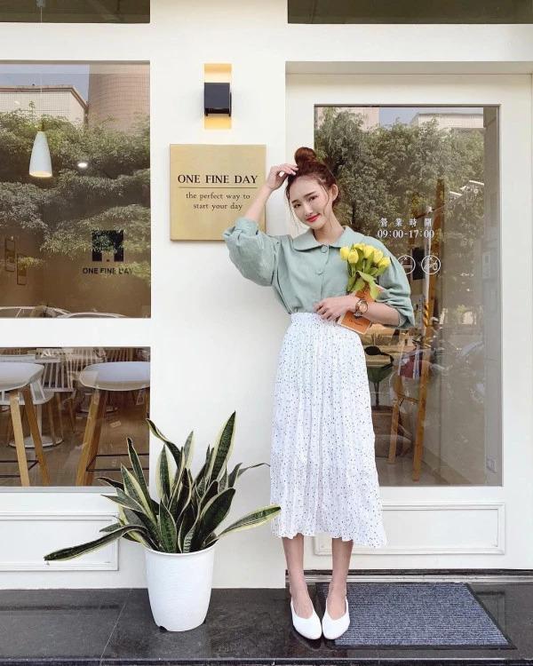 Nếu bạn muốn thay đổi phong cách chững chạc hơn thì áo sơ mi là gợi ý tốt nhất khi mix cùng chân váy xếp tầng dài. Chị em có thể lựa chọn một chiếc áo sơ mi thêu hay chấm bi để không bị nhàm chán, hãy phối cùng đôi giày cao gót mũi nhọn để nâng tầm phong cách chẳng thua kém fashionista.