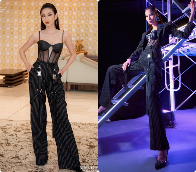 Gắt là thế, vậy mà Thùy Tiên vẫn có phần lép vế trước sự sắc lạnh gai góc của Hoàng Thùy khi đụng hàng. Cùng là bộ suit kẻ phá cách mix&match cùng áo corset xuyên thấu, Hoàng Thùy quyết giật trọn spotlight với chiếc blazer cắt vạt nham nhở.