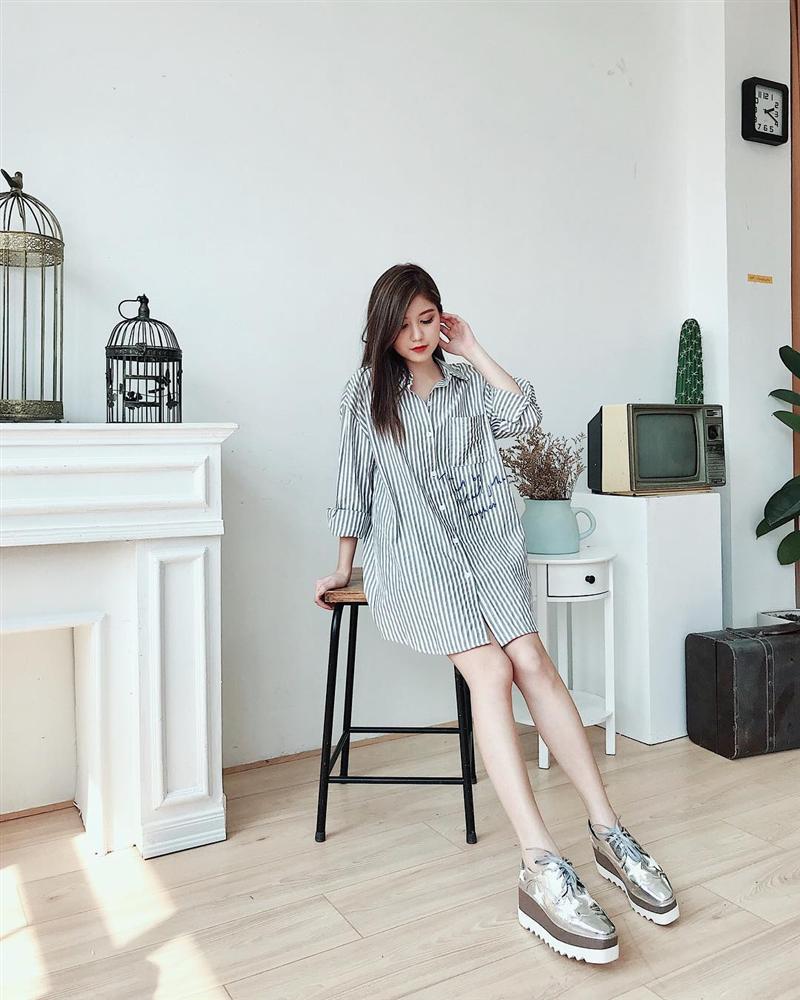 An Japan khoe chân thon nuột nà với style giấu quần cùng chiếc váy dáng sơmi kết hợp giày đế bánh mì tôn dáng.