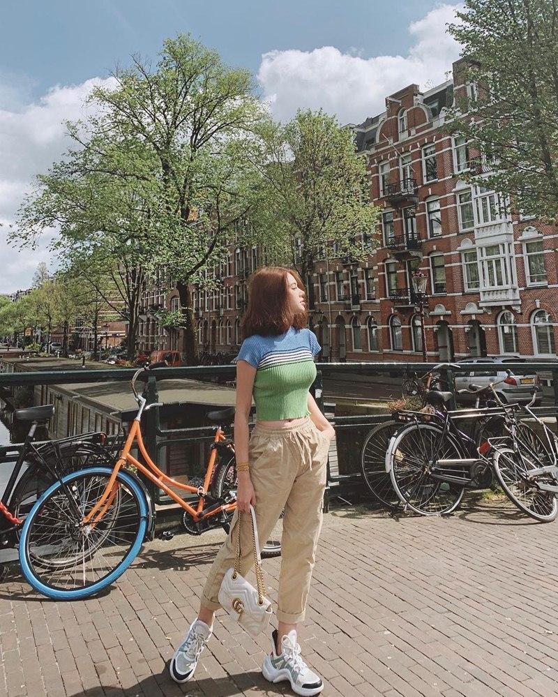 Trút bỏ những bộ cánh hở bạo, điệu đà, Jolie Nguyễn "thả dáng" ở trời Âu trong với street style năng động. Cô nàng bắt cặp áo crop top ôm sát và quần khaki, mang giày sneaker của Louis Vuitton và không quên xách theo chiếc túi Gucci yêu thích.