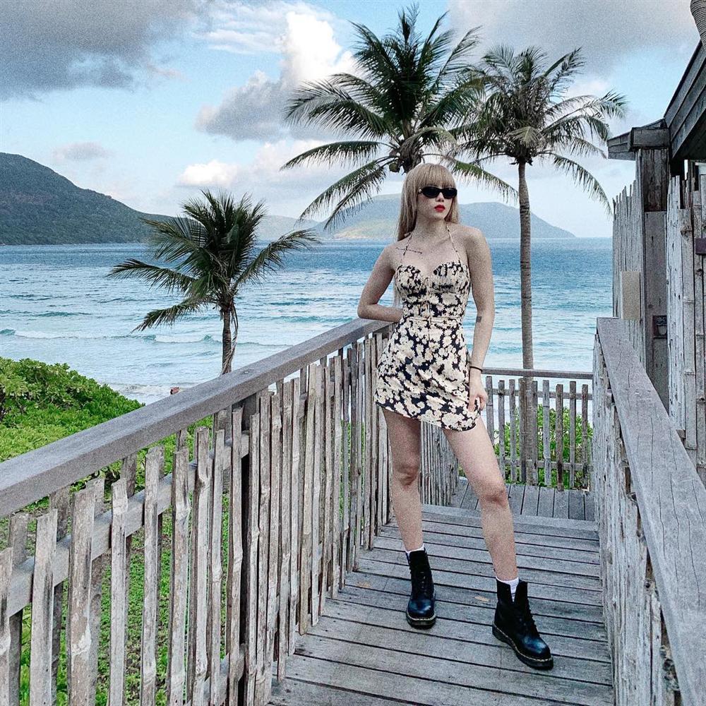 Thiều Bảo Trâm vừa gợi cảm lại không kém phần cá tính khi mặc váy cúp ngực họa tiết với boots hầm hố và kính râm.