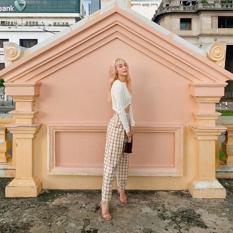 Áo crop top và quần kẻ cạp cao, thêm đôi sandals cùng tông màu pastel là combo thời trang giúp Mlee khoe vòng eo triệt để.