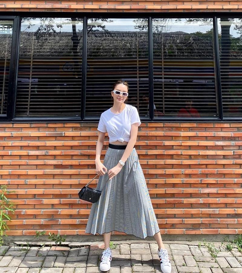 Trong khi đó, Thiều Bảo Trang lại điệu đà hơn hẳn với áo xoắn vạt kết hợp chân váy xếp ly dáng dài và giày thể thao.