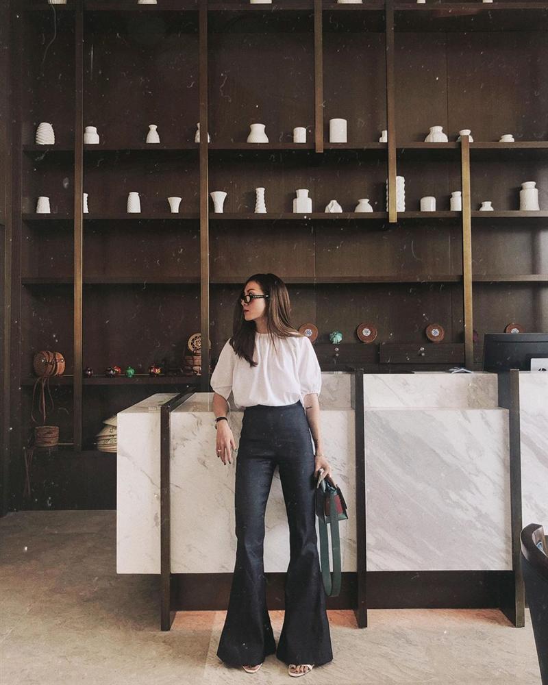 Yến Nhi “đổi gió” phong cách văn phòng với áo blouse trắng tay bồng và quần ống loe cạp cao.
