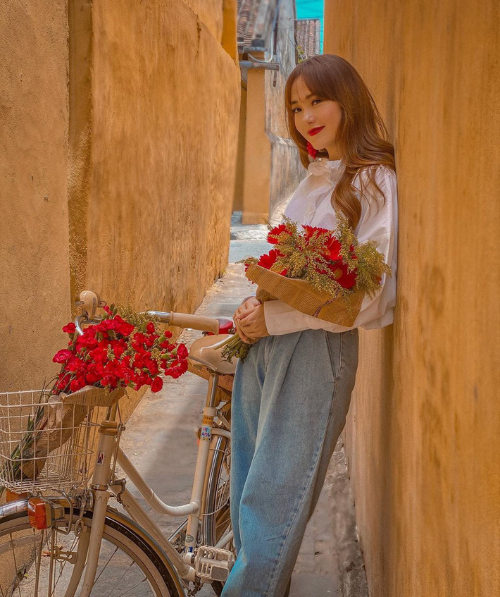 Quần jeans xanh sáng màu vốn là item "hot hit" nhưng nay có thêm chi tiết xếp ly càng làm set đồ của Minh Hằng thêm hoàn hảo. Phong cách thời trang của "bé Heo" tiến bộ theo thời gian, hết sức đáng khen đó chứ!