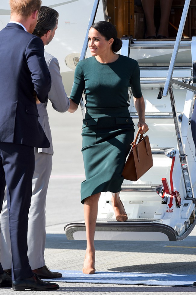 Hạ cánh xuống sân bay tại thành phố Dublin, Công nương Meghan đã lập tức lọt vào ống kính phong viên với diện mạo rạng rỡ và phong cách thanh lịch chỉn chu.