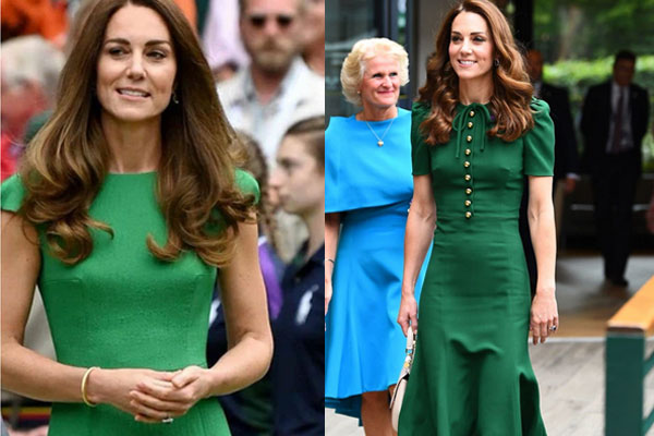 Khi tham dự một trận đấu thể thao, Kate đã diện chiếc váy xanh da trời nhạt, đặt riêng từ nhà thiết kế Emilia Wickstead. Váy có thân trên ôm sát, thân dưới là kiểu dáng midi. Chi tiết đặc biệt của chiếc váy nằm ở phần viền cổ vuông với thiết kế dạng dây vai xoắn. So với bản gốc, Kate đã thêm một chiếc nơ xinh trên ngực cho chiếc váy bớt đơn điệu.