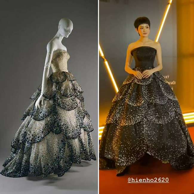 Chưa hết, mẫu váy mà Hiền Hồ diện còn nhìn giống tới 90% với mẫu váy của thương hiệu Christian Dior (chiếc váy nằm trong BST Christian Dior's "Junon" in Fall 1949 Haute Couture). Nếu so sánh với phiên bản gốc, chiếc váy mà Hiền Hồ mặc nhìn kém sang hơn hẳn.