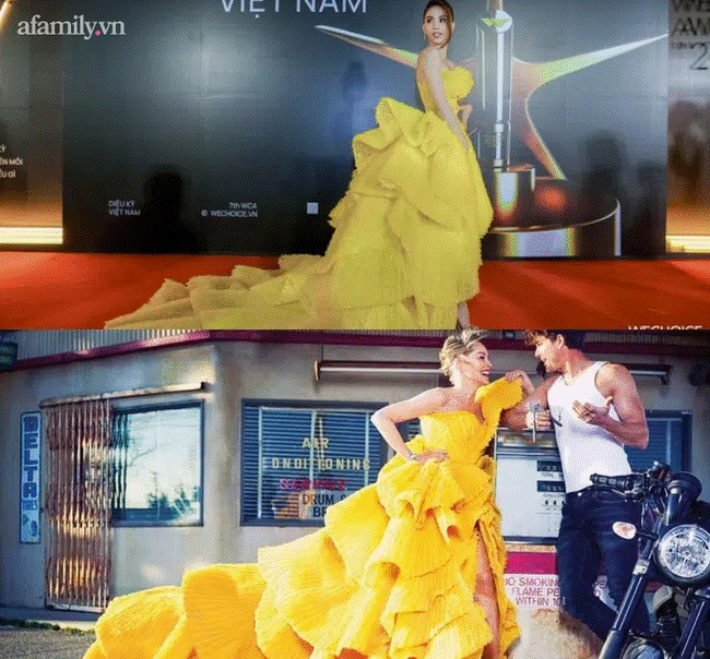 Phạm Hương cũng từng vướng nghi án diện váy nhái của MICHAEL CINCO Dubai năm 2016. Có lẽ NTK đã mượn ý tưởng kiểu dáng cũng như cách chơi màu sắc, tuy nhiên so sánh về chất liệu vải cũng như loạt hạt đính trên váy chắc chắn thua xa phiên bản gốc.