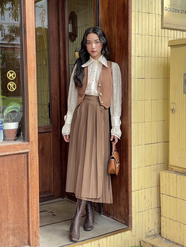 Chân váy xếp ly bồng bềnh, nữ tính vừa xinh xắn lại vừa dễ diện. Bên cạnh tông màu đen, trắng quen thuộc thì bạn hãy thử sắm màu be để "đổi gió" và khiến mình trở nên trendy hơn đi.