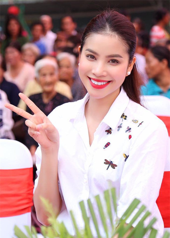 Phạm Hương rực rỡ như nắng mai với chiếc áo sơ mi trắng phom dáng cơ bản nhưng lại không hề nhàm chán với những họa tiết trang trí vui mắt, với lựa chọn này, cô chỉ cần bỏ ra 500 ngàn đồng.