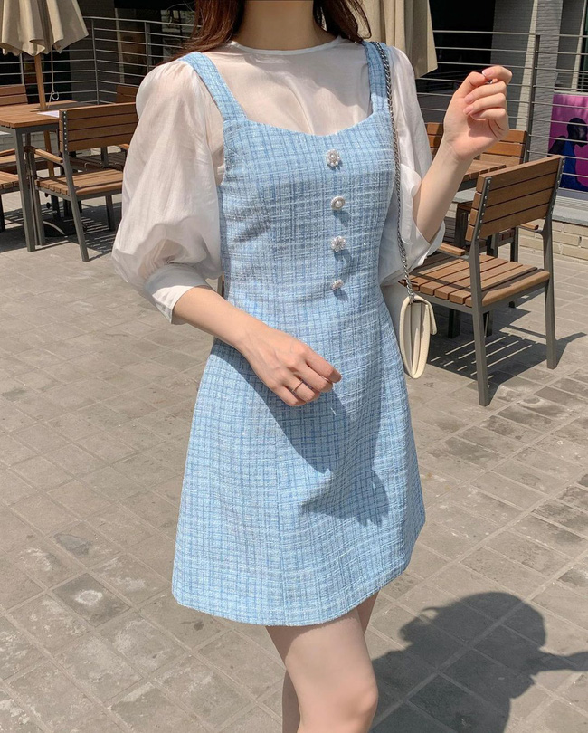 Những nàng theo đuổi style nữ tính, ngọt ngào chắc chắn sẽ phải lòng combo áo blouse tay bồng layer bên trong váy hai dây vải tweed xinh xẻo như tiểu thư này.