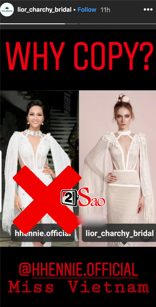 Lior Charchy Bridal - một thương hiệu đồ cưới Israel có trụ sở ở Tel Aviv đã bức xúc đăng ngay trên stories về việc H'Hen Niê mặc váy nhái theo sản phẩm mà Lior Charchy Bridal đã ra mắt trước đó.