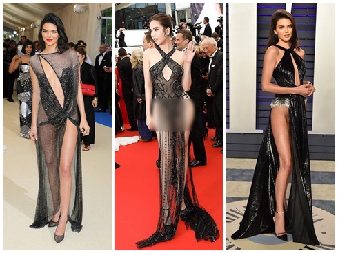Dự thảm đỏ liên hoan phim Cannes 2019, Ngọc Trinh "chơi lớn" với chiếc đầm xuyên thấu "mặc như không mặc". Chẳng những bị chỉ trích phản cảm, bộ cánh mà Ngọc Trinh diện còn bị giới mộ điệu săm soi có nhiều chi tiết đạo nhái. Cụ thể, chiếc đầm mỏng tang cắt xẻ này là sự kết hợp của hai thiết kế mà Kendall Jenner từng mặc, đều có chi tiết xẻ cao quá hông và được làm trên chất liệu vải xuyên thấu.