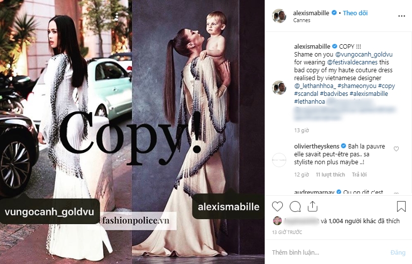 Nhà mốt nước Pháp bức xúc: "Copy! Vũ Ngọc Anh thật đáng xấu hổ khi diện món đồ nhái do Lê Thanh Hòa copy từ thiết kế Haute Couture của tôi". Có thể thấy, hai bộ cánh có nhiều điểm giống nhau từ cách xếp đường tuarua đến phom dáng, chỉ khác nhau ở chất liệu.