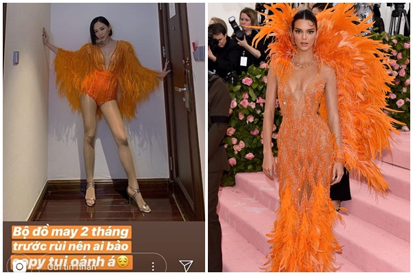 Thiết kế bodysuit màu cam, đính lông vũ nổi bật của Tóc Tiên cũng bị cho là lấy cảm hứng từ bộ cánh của Kendall Jenner tại thảm đỏ Met Gala 2019. Nhưng giọng ca "Em không là duy nhất" đã nhanh chóng phản pháo và cho rằng: "Bộ đồ may 2 tháng trước rồi nên ai bảo copy, tôi oánh á."
