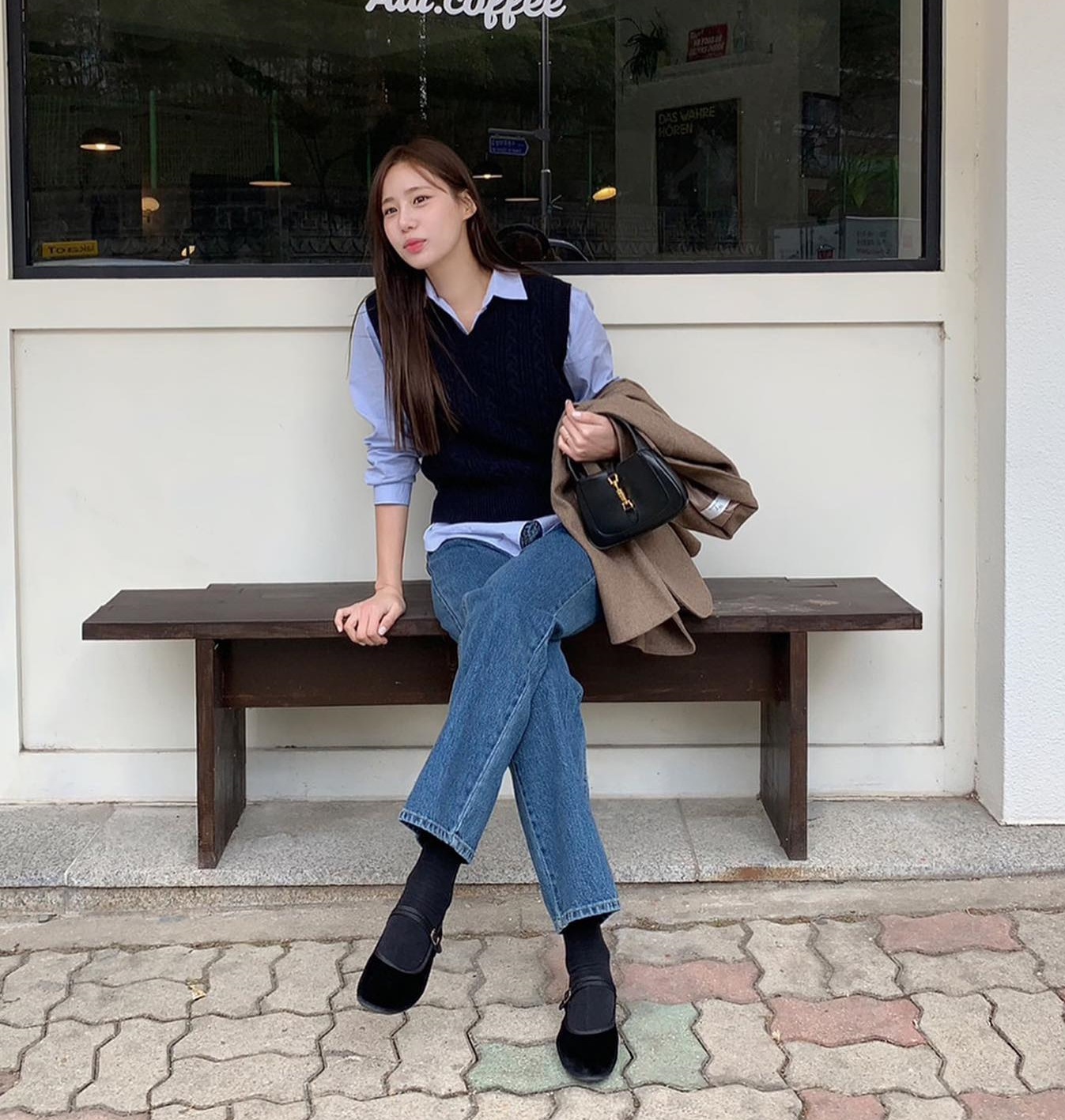 Cho đến thời điểm hiện tại, áo len gilet vẫn là món thời trang thịnh hành. "Nửa kia" hoàn hảo của áo len gilet không gì khác chính là áo sơ mi dài tay. Bộ đôi áo sơ mi + áo len gilet còn kết hợp rất ăn ý với quần jeans ống đứng, và giày Mary Jane ngọt ngào. Bạn có thể diện công thức này đi dạo phố hoặc tới công sở nhờ sự trẻ trung, sành điệu nhưng vẫn thanh lịch.