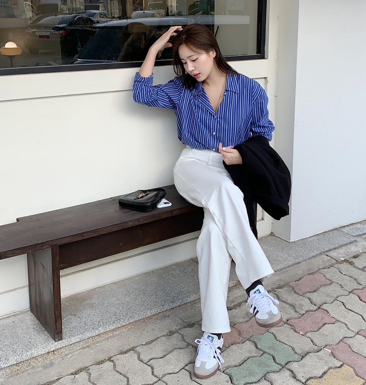 Áo sơ mi kẻ sọc là món thời trang rất đáng sắm. Kiểu áo này trẻ trung và nổi bật, đồng thời chuẩn mốt với thời gian. Sự kết hợp giữa áo sơ mi kẻ sọc và quần trắng sẽ tạo nên set trang phục hài hòa, tinh tế, lại hack tuổi rất hiệu nghiệm. Muốn set trang phục trông năng động hơn, bạn có thể đi giày sneaker trắng thay vì diện những kiểu giày đứng dáng.