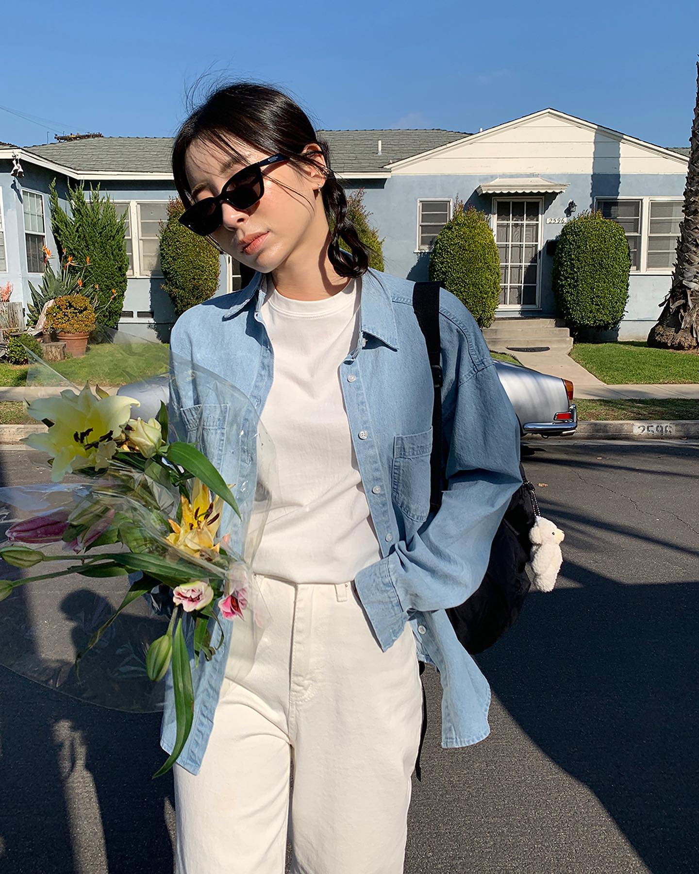 Áo sơ mi denim không chỉ lý tưởng để diện vào mùa hè, bạn còn có thể tận dụng item này khi hoàn thiện các set đồ mùa xuân. Cách phối đồ cũng rất đơn giản, đó là layer áo sơ mi denim bên ngoài áo thun và quần jeans trắng. Tổng thể này tươi sáng, trẻ trung mà vẫn có sự thanh lịch.