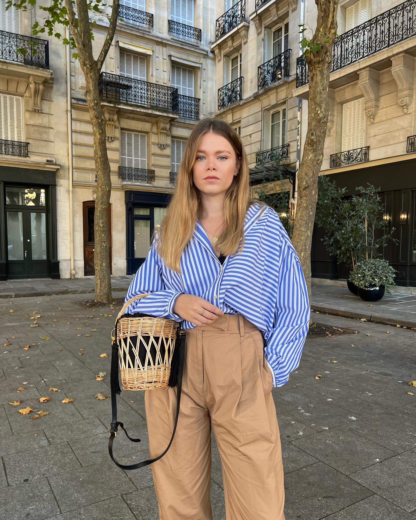 Thêm một công thức hack tuổi cực hiệu quả với áo sơ mi. Cụ thể, bạn hãy chọn áo sơ mi họa tiết, phối màu tươi sáng và mix cùng quần màu be. Bộ đôi này tươi tắn và cũng có sự hài hòa, trang nhã. Quý cô người Pháp còn tô điểm một chiếc túi cói, giúp cả tổng thể trang phục thêm phóng khoáng.