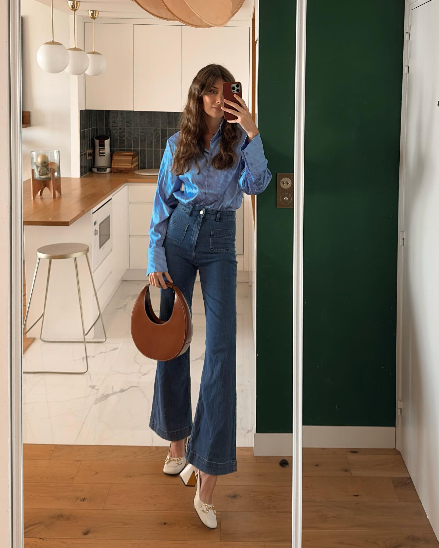 Với những item như áo sơ mi lụa và quần jeans ống loe, quý cô người Pháp đã tạo nên set trang phục rất sang chảnh. Đôi giày gót vuông mang đến nét cổ điển, nữ tính cho set trang phục. Đây còn là công thức diện đồ tôn dáng hiệu quả, nhờ mẫu quần ống loe, cạp siêu cao.