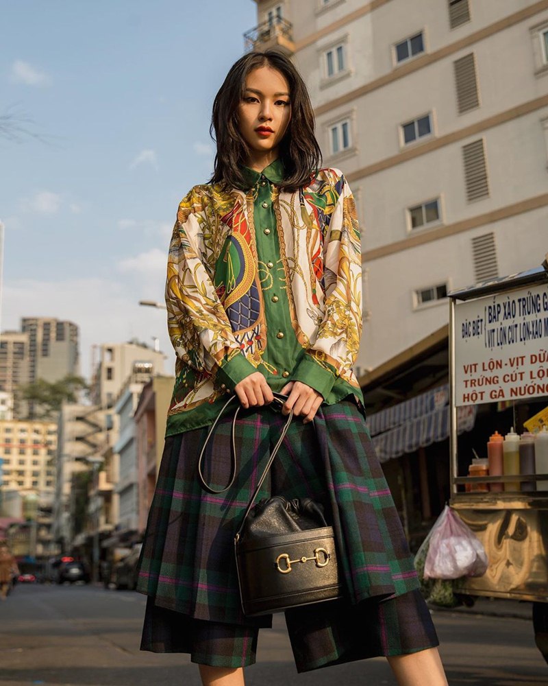 Phí Phương Anh cũng diện nguyên set đồ họa tiết của Gucci, phối sơ mi và chân váy midi phá cách. Chân dài cũng có màn đụng hàng chiếc túi bucket với Khánh Linh nhưng ở phiên bản "full black".