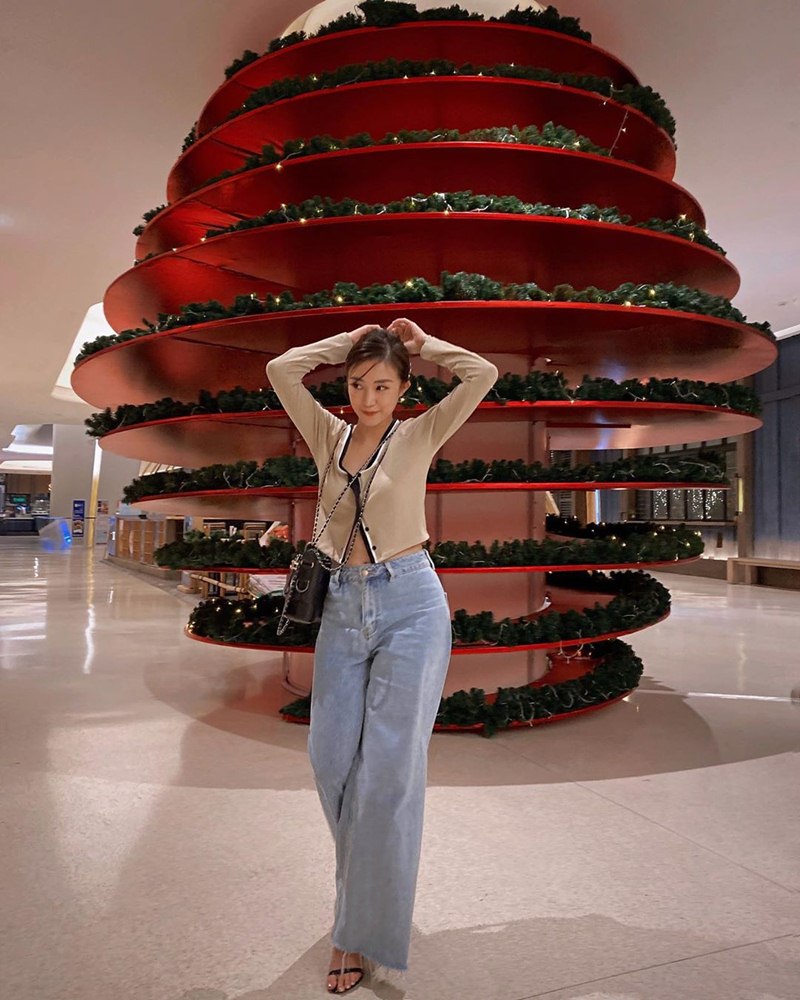 Salim mix đồ theo xu hướng của các idol Hàn Quốc. Hot girl kết hợp quần jeans ống rộng với cardigan lửng, mở cúc dưới khoe vòng eo thon.