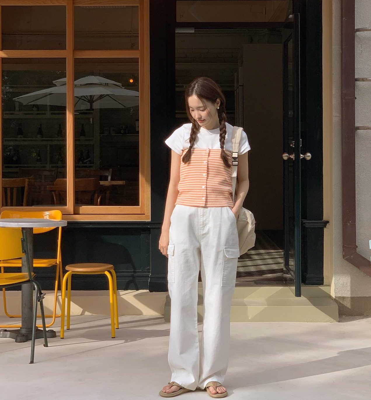 Quần túi hộp đang là món thời trang phổ biến. Chị em có thể diện item này theo style ngọt ngào và trẻ trung, đó là kết hợp cùng áo thun trắng, layer bên ngoài áo quây họa tiết kẻ. Để tạo sự thoải mái cho outfit, đôi dép xỏ ngón là lựa chọn lý tưởng.