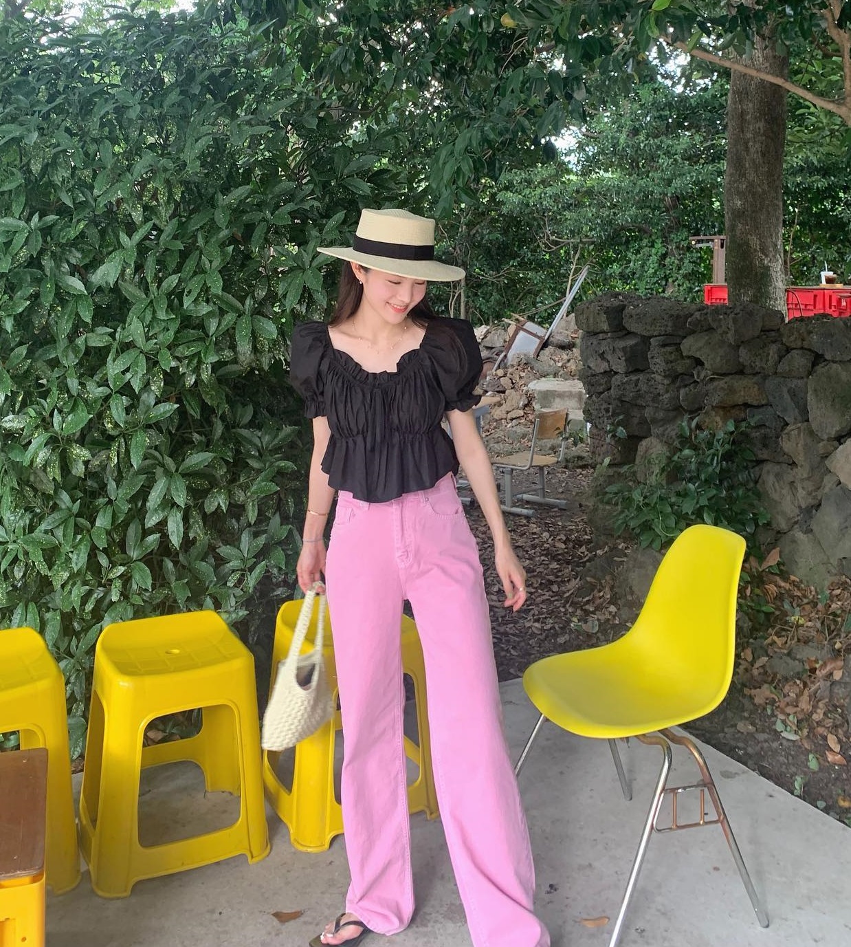 Làm thế nào để trông trẻ trung khi diện áo blouse tối màu? Câu trả lời là bạn hãy kết hợp cùng một chiếc quần mang tông màu hồng pastel. Cách mix đồ này khá độc đáo, giúp style đi du lịch của bạn có sự mới mẻ, đột phá.
