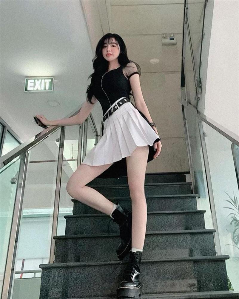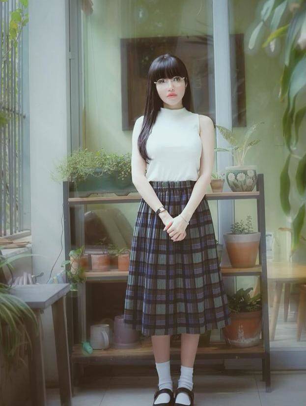 Cô thường mix áo thun ôm cùng chân váy kẻ trẻ trung.