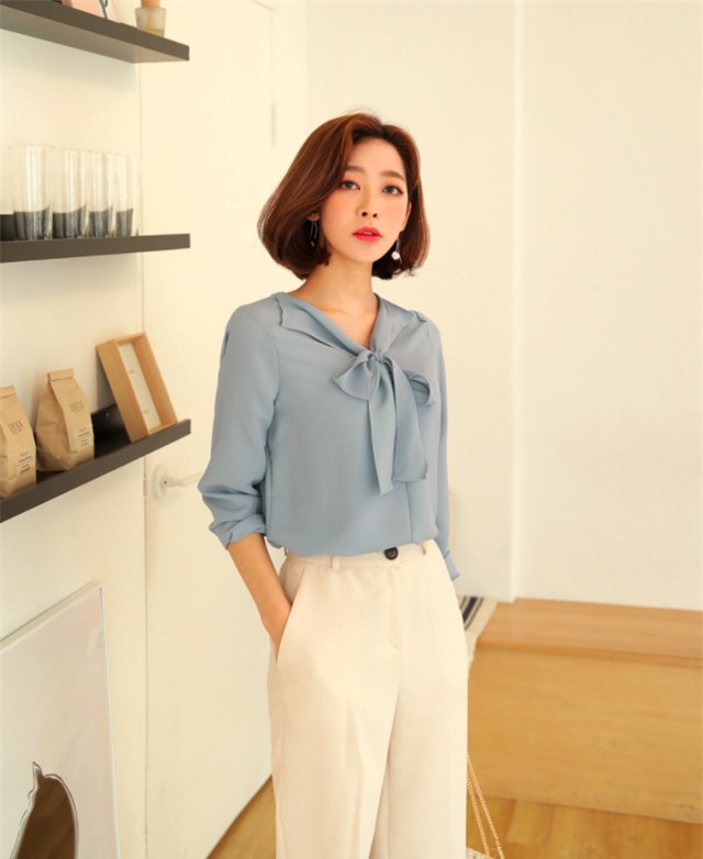 Cùng với gam màu xanh dịu mát, chất liệu lụa/voan mềm mại của những thiết kế áo blouse càng giúp phong cách công sở của các nàng thêm phần nữ tính, thanh lịch.