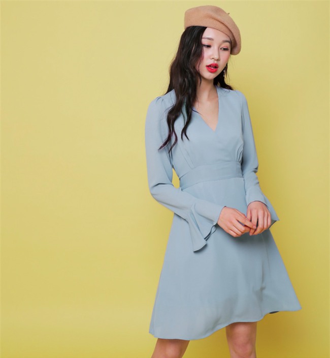 Váy liền dáng xòe với gam màu xanh nhẹ nhàng chẳng cần cầu kỳ vẫn giúp nàng công sở thêm duyên dáng, tinh khôi dù đi làm hay đi chơi.