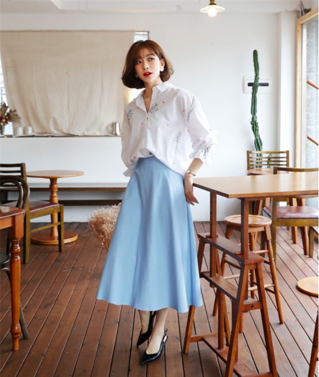 Một cô nàng theo đuổi phong cách thanh lịch, tinh tế sẽ mê ngay cặp đôi chân váy xòe cùng áo sơmi trắng cách điệu.