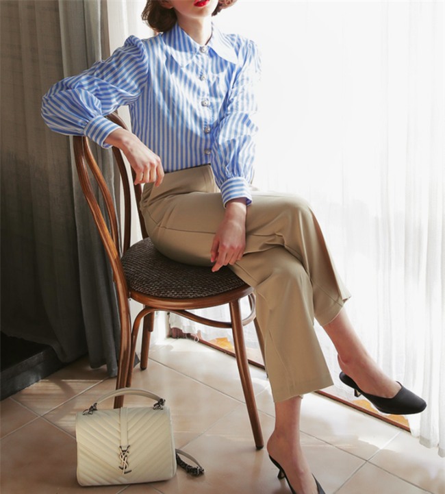 Một cách kết hợp để cách nàng luôn nữ tính duyên dáng chốn công sở: sơmi xanh kẻ thanh mảnh mix cùng chân váy midi...