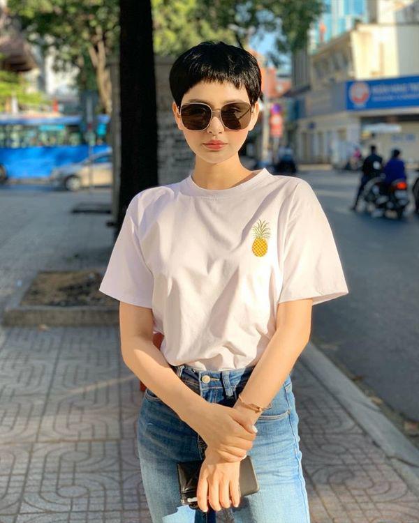 Áo phông, áo sơ mi là những mẫu áo không thể thiếu trong tủ đồ thời trang của Hiền Hồ.