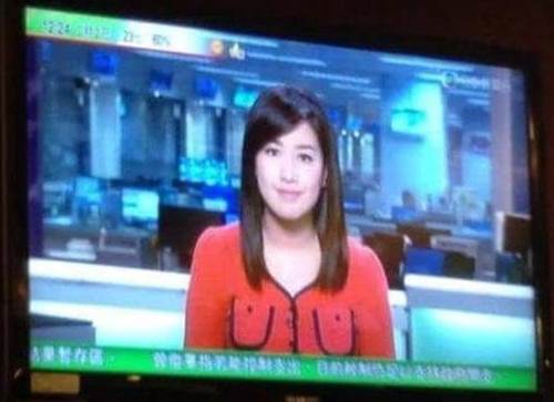 Nữ biên tập viên có ngoại hình gần giống với Á hậu Tú Anh khiến khán giả Trung Quốc được một phen cười hả hể khi diện mẫu áo có thiết kế... hại mắt. Đường viền đen quanh túi cộng với khuy "đúng điểm" khiếm cô như thể đang cố gây tò mò về vòng 1.