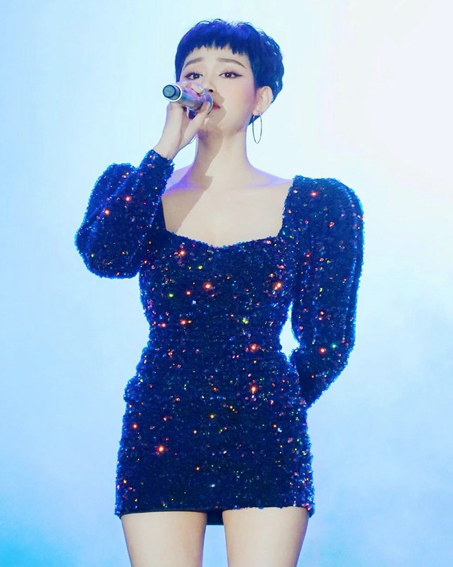Váy ống, váy cổ chữ U tôn bờ vai trắng mịn, xương quai xanh quyến rũ cho nữ ca sĩ. 9X hiếm khi chọn váy áo cắt xẻ táo bạo. Những bộ váy cô sử dụng khoe khéo vóc dáng gợi cảm theo hướng tinh tế, thanh lịch.