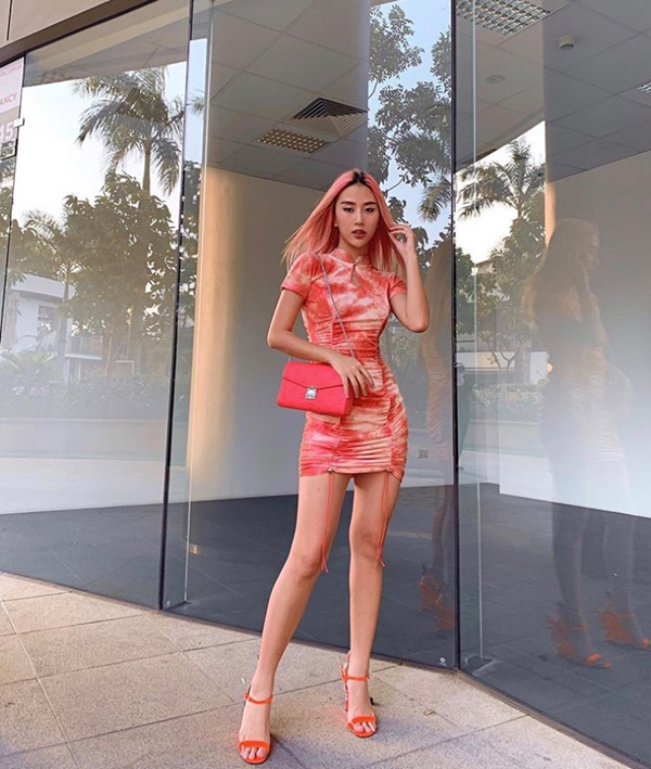 Váy ôm sắc cam màu loang với thiết kế tôn dáng giúp fashionista 9x khoe sắc lộng lẫy. Phụ kiện túi xách, giày cao gót đều được cô nàng mix đồng điệu, thậm chí đến mái tóc cũng được nhuộm tiệp màu với trang phục.