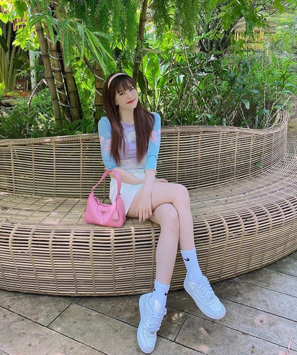 Đổi gió với cách mix đồ basic hơn của Thiều Bảo Trâm: áo ống màu loang, quần short lưng cao, tất cao cổ và giày thể thao mang đến cho người đẹp họ Thiều sự quyến rũ, cá tính đậm chất ''high teen''.