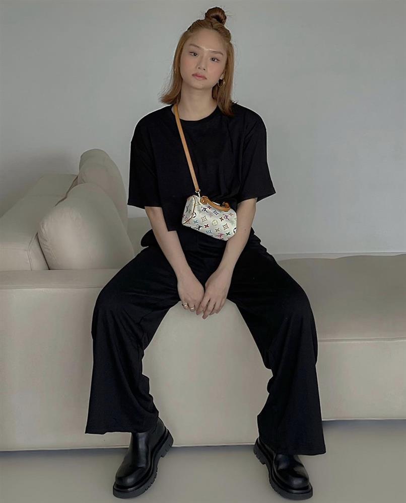 Để mặc một bộ cánh màu đen từ trên xuống dưới với áo thun, quần suông, giày oxford mà không nhàm chán, Miu Lê đã khéo léo chọn đeo chiếc túi mini màu trắng họa tiết của LV tạo điểm nhấn.