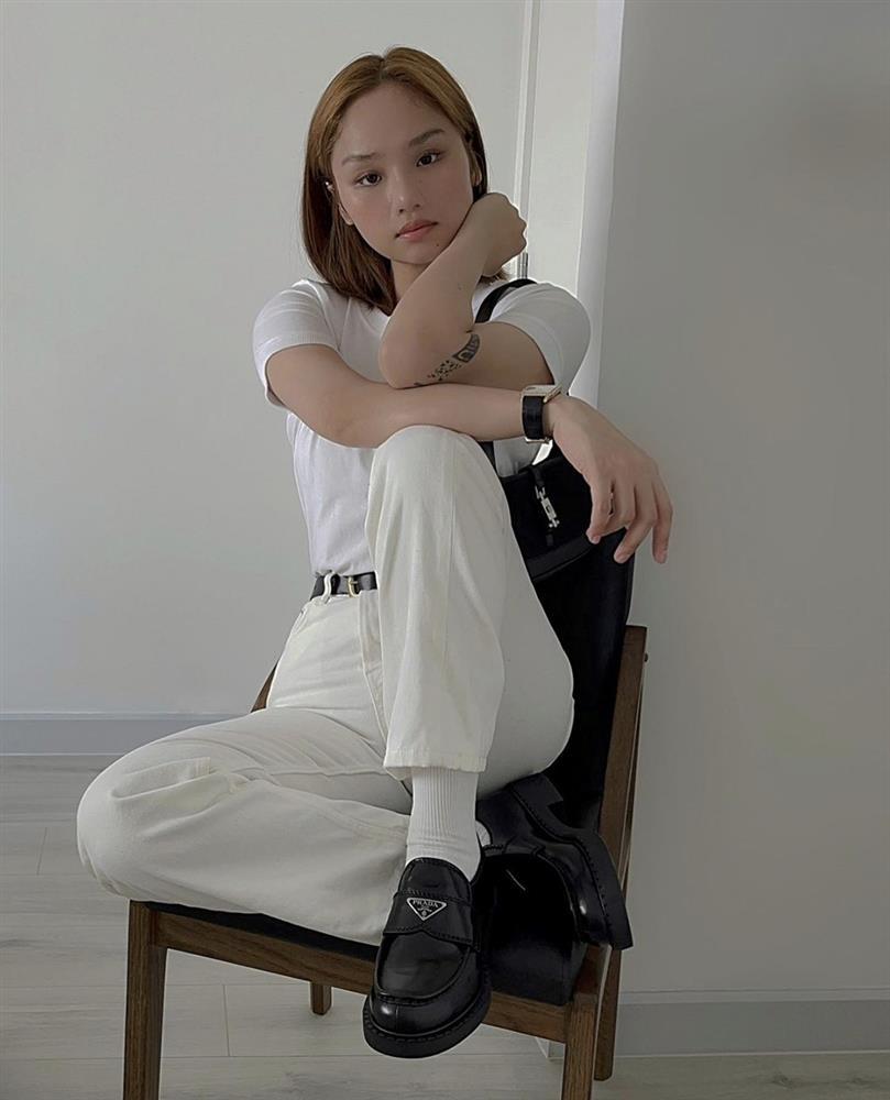 Với set đồ màu trắng gồm áo thun, quần kaki, nữ ca sĩ chọn phụ kiện giày oxford và túi kẹp nách cùng tông đen đến từ nhà mốt Prada.