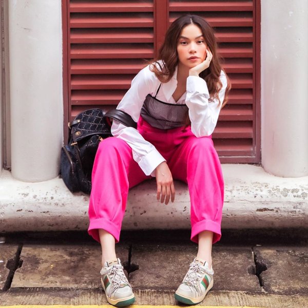 Áo sơ mi trắng thì quá quen thuộc rồi, nhưng phối với áo lưới bên ngoài cùng quần màu hồng nữ tính và giày thể thao thì quá đặc biệt, liệu bạn gái nào sẽ thích.
