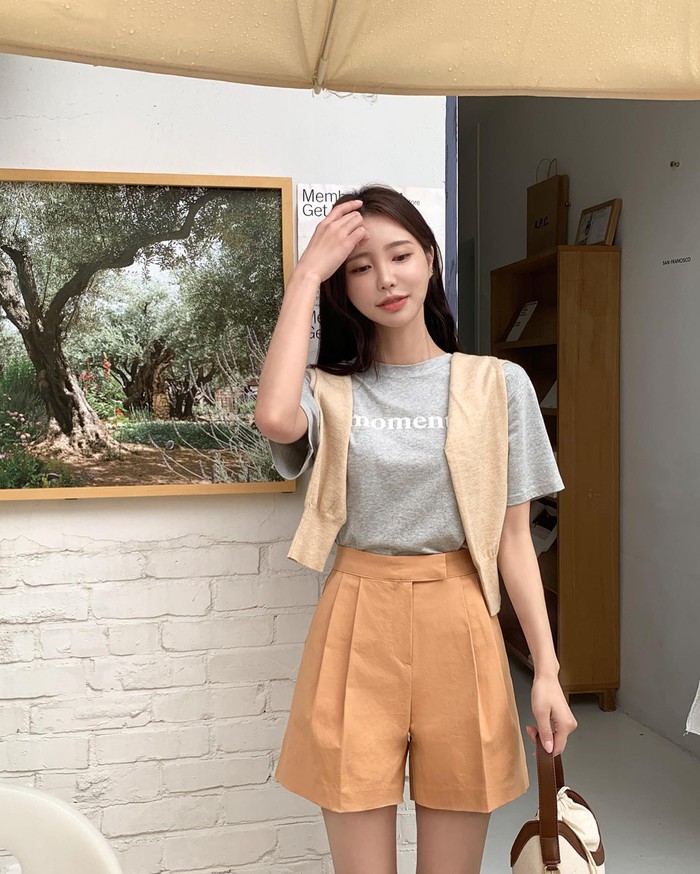 Áo thun màu xám và quần short cam pastel kết hợp với nhau đầy ăn ý, tạo nên set đồ trẻ trung, trang nhã. Chị em nên sơ vin để nâng cấp vẻ sang xịn mịn cho bộ đồ. Việc tô điểm chiếc áo quàng vai giúp bộ đồ thêm phóng khoáng và hợp xu hướng.