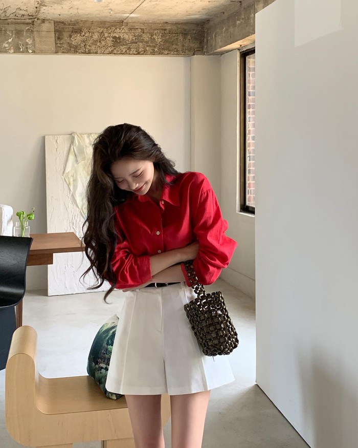 Chị em đừng bỏ qua áo sơ mi màu nổi vì đây vẫn là xu hướng của mùa hè. Áo sơ mi màu đỏ phù hợp để mix với quần short trắng, tạo nên set đồ bắt mắt nhưng không "sến sẩm". Vốn dĩ, quần short cải thiện chiều cao rất hiệu quả nhưng khi sơ vin, vóc dáng còn được "hack" tối ưu hơn.