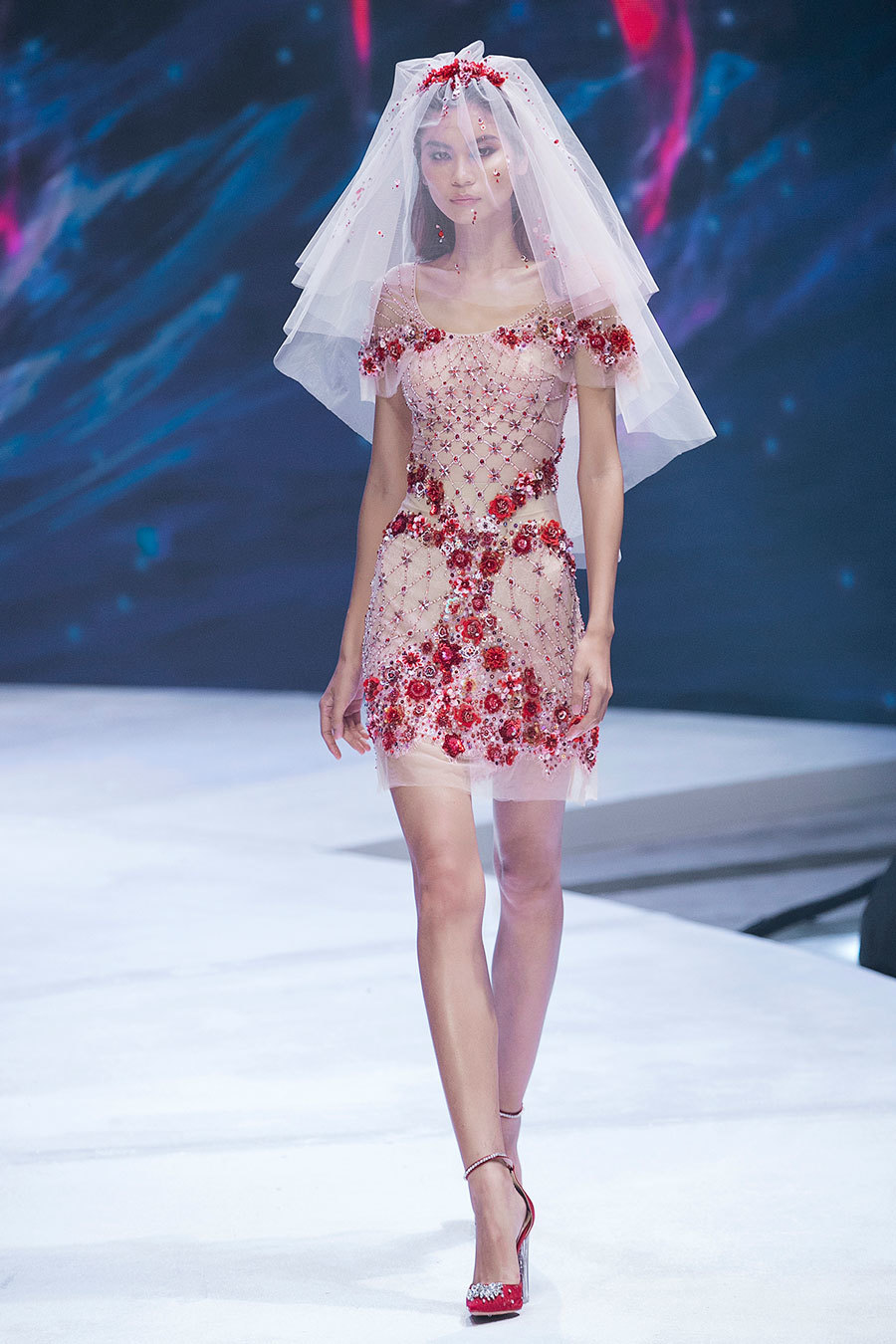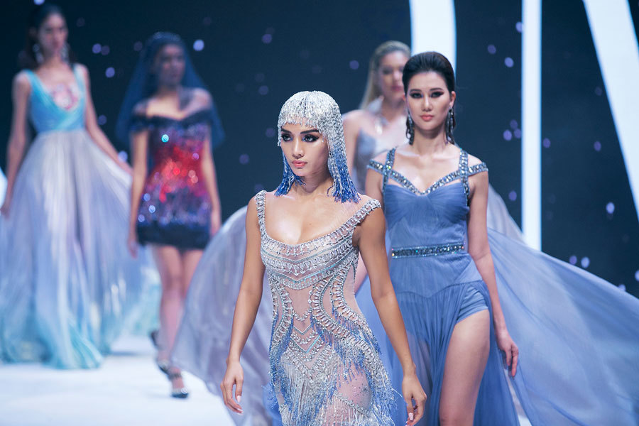 Điểm nhấn của những mẫu váy áo là chất liệu ren đặc trưng kết hợp các chi tiết đính đá cầu kỳ, gợi lên hình ảnh quen thuộc của đại dương như san hô, bóng biển, đáy biển…